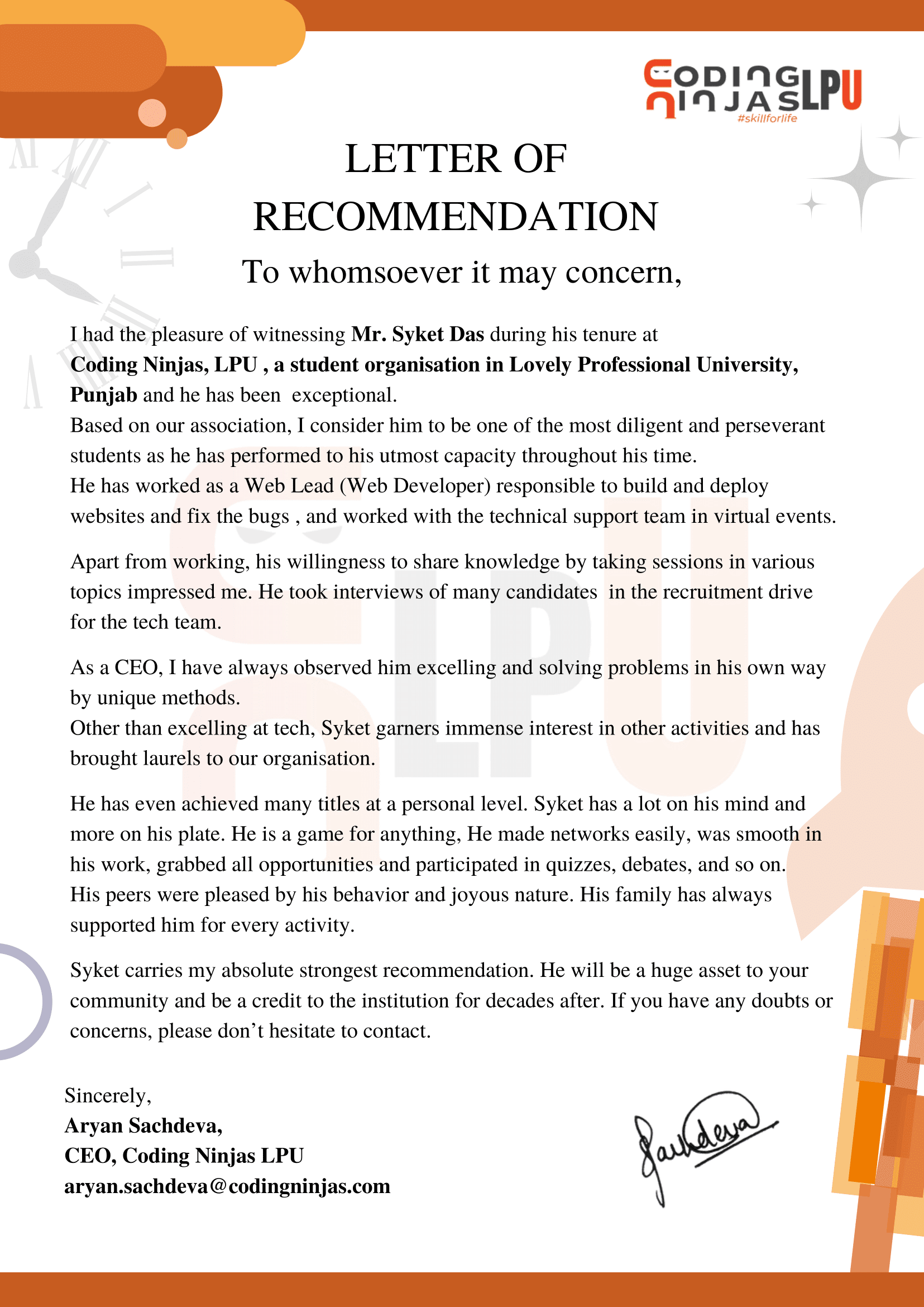 I have been a part of various organizations and have been awarded for my work. Here are some of my achievements and recommendations.